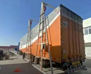 當貨車處于安全位置后,工作人員再把支架和微型環鏈電動葫蘆組合吊裝設備推移到貨車車廂上方,利用電動葫蘆把車廂內的重物吊運到高處,方便工作人員轉運貨物。