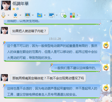 ? 一些的用戶在使用小型電動葫蘆時,會有一些自己的疑問,有的用戶甚至問小編電動葫蘆可以吊人不?下面我們就把詳細的聊天記錄展示給大家。